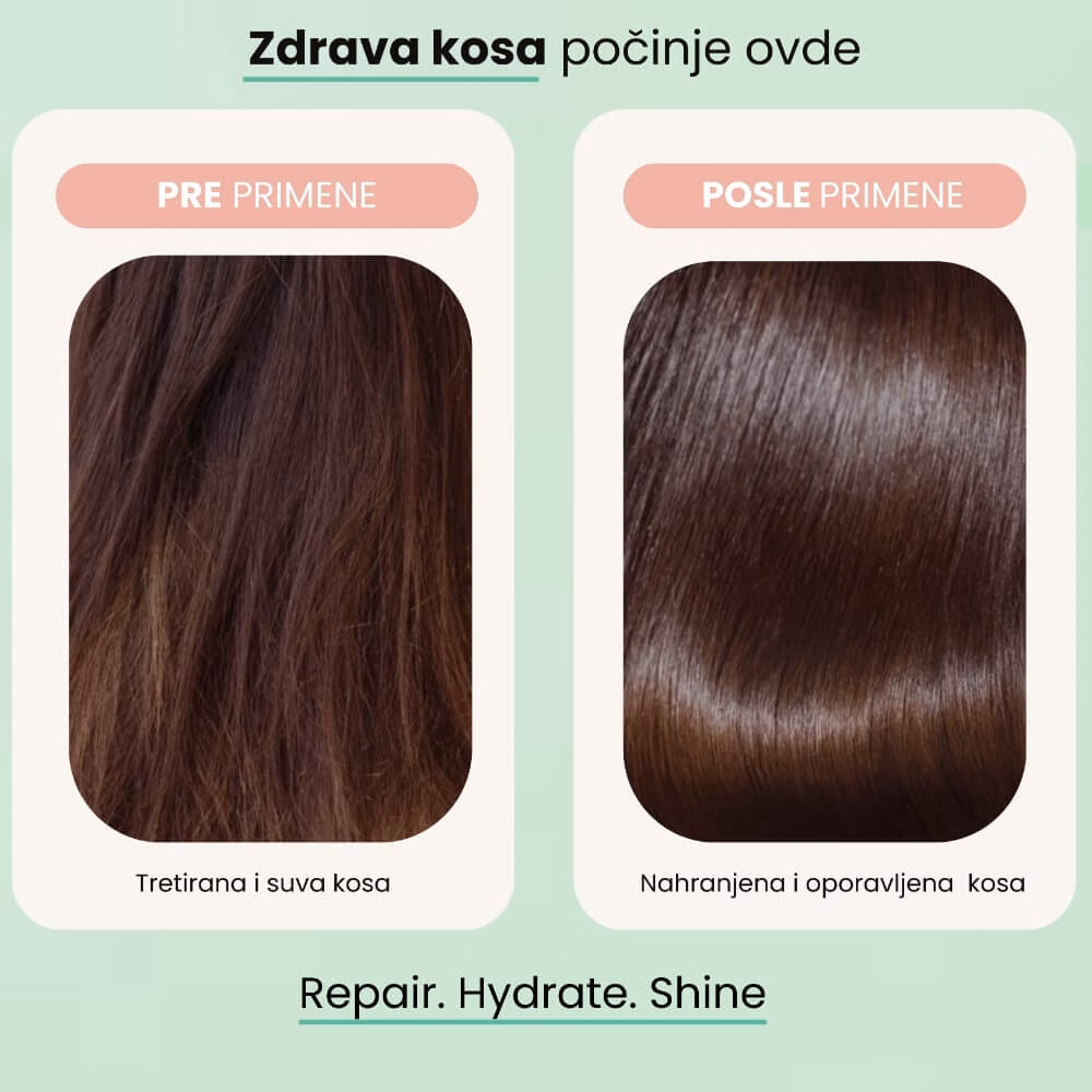 - Maska: nakon pranja, naneti na dužinu i krajeve kose, ostaviti da deluje 5–10 minuta i zatim isprati.